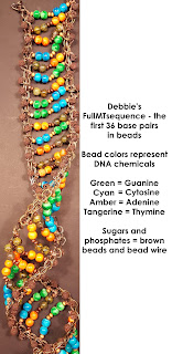 Those last two images also include my beaded representation of the first 36 base pairs of my actual mtDNA sequence. I created this a year or two ago to have an interesting display of DNA for events. As I have told several people, if I were going to do this again I would definitely hire an experienced beader and not try to do this myself! But I would love to see more crafty representations of DNA. Here, I used a bead whose color name starts with the same letter as the DNA chemicals represented: Amber = A = adenine, Cyan = C = Cytosine, Green = G = Guanine, and Tangerine = T = Thymine. Brown beads and the wire represent the sugars and phosphates.